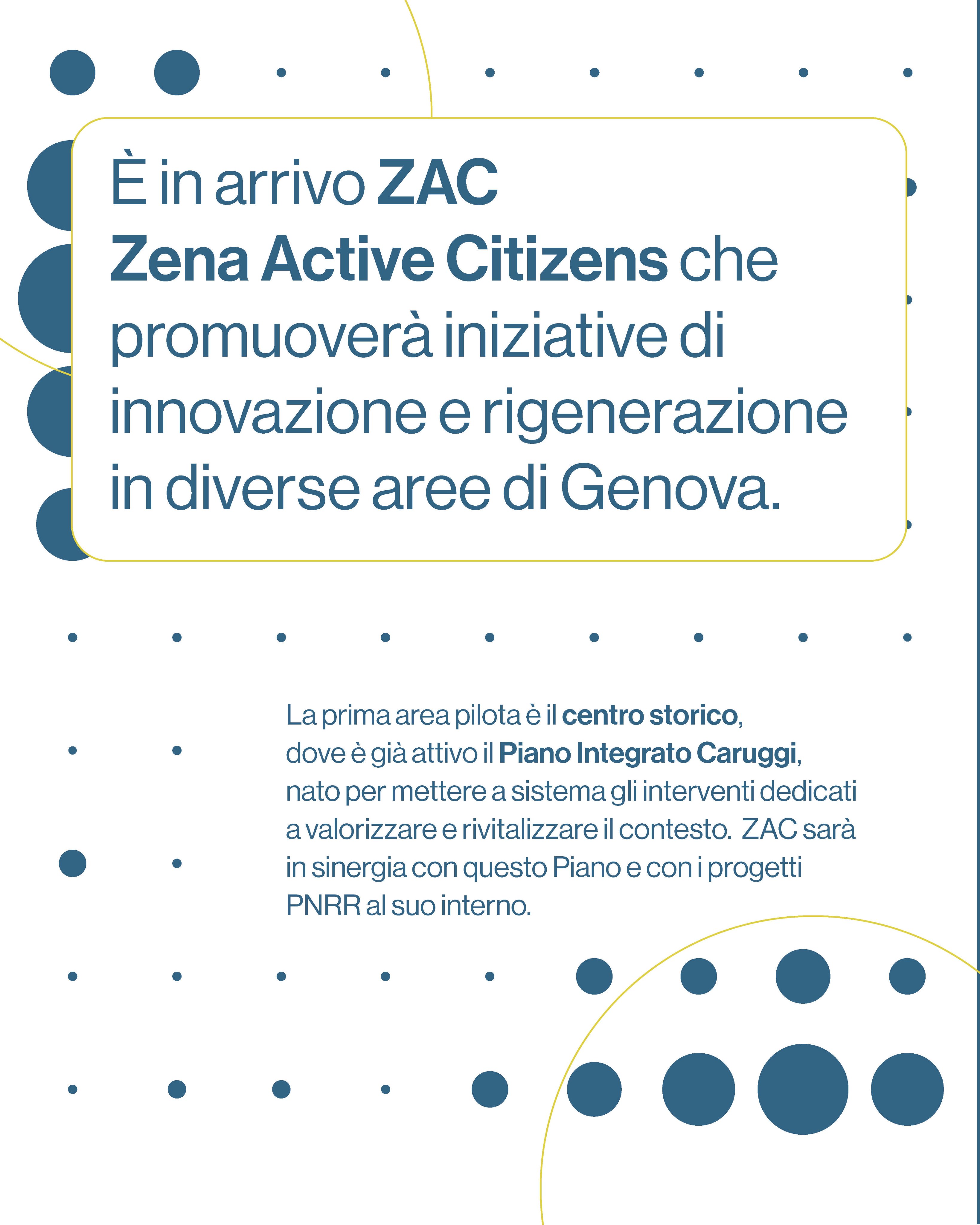Il progetto “ZAC – Zena Active People” in continuità con il progetto ZIP - Zena Inovative People pone ancora di più l’accento sul sostegno alla rivitalizzazione, al rilancio e alle trasformazioni urbane legate alle esigenze espresse dalle città, con lo scopo di attivare processi di valorizzazione dell’economia urbana e di ripopolamento del tessuto economico locale anche per creare realtà più resilienti.